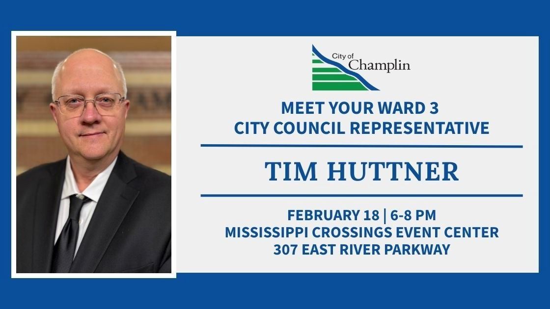 Ward 3 residents are invited to meet Councilmember Tim Huttner on February 18 from 6-8pm at the Mississippi Crossings Event Center. This open house event provides an opportunity to share feedback, ask questions, and learn more about Ward 3 priorities.